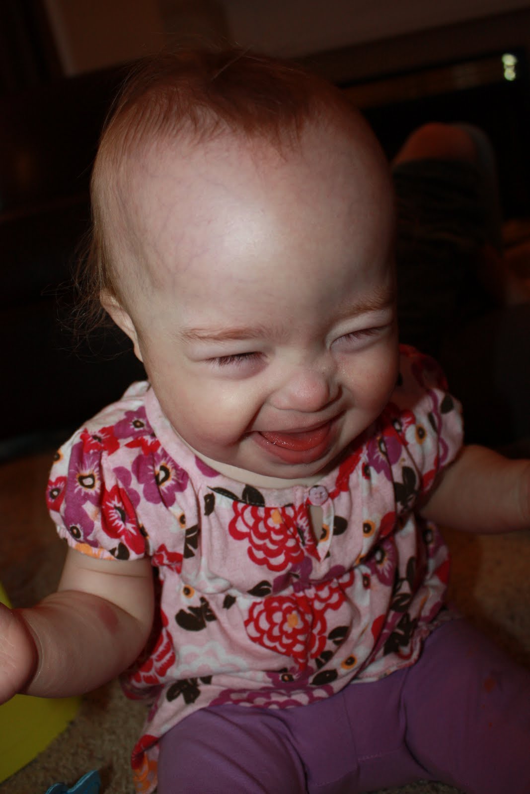 Now, she smiles! In the morning when I go over to her crib. When I pick her up. When I give her kisses. When she sees the dog coming over to play with her. And today, I can say she was laughing. When I made the tickle sound and she would see my hands coming I would get a big smile and some "laughing" still not totally natural sounding, but laughing.